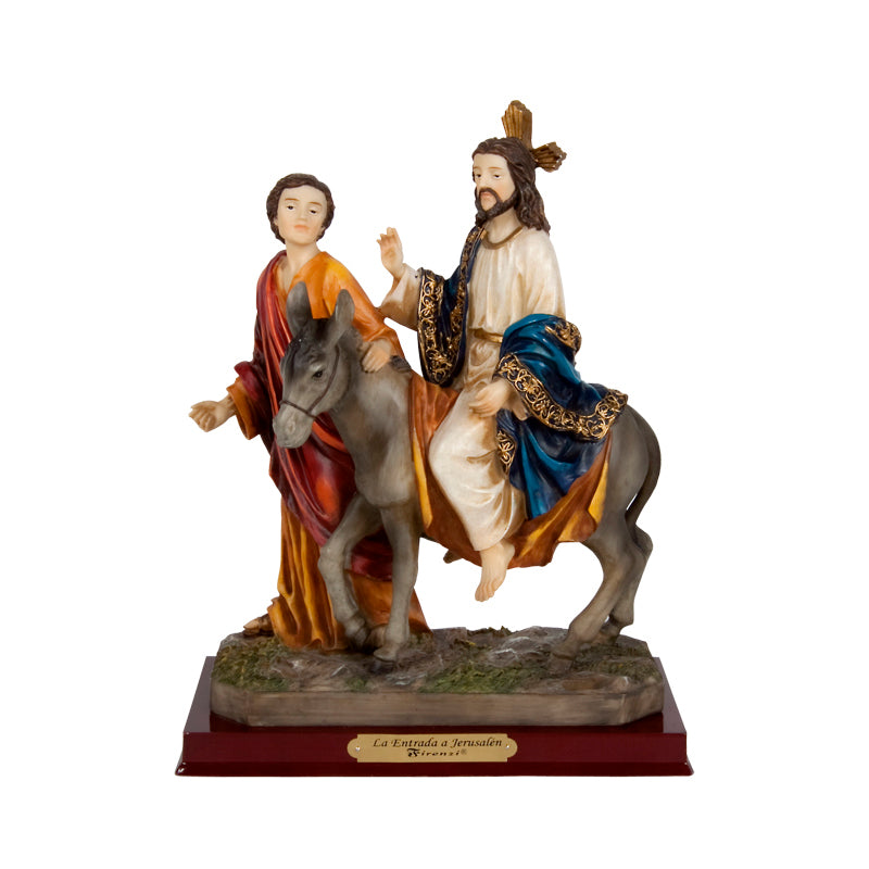 Esta majestuosa figura representa uno de los momentos más emblemáticos de la vida de Jesús: su entrada triunfal a Jerusalén montado en un burro, mientras es recibido con palmas y alabanzas. Cada detalle de la escultura refleja la emoción y el significado espiritual de este acontecimiento, evocando la humildad y el amor de Cristo hacia su pueblo.